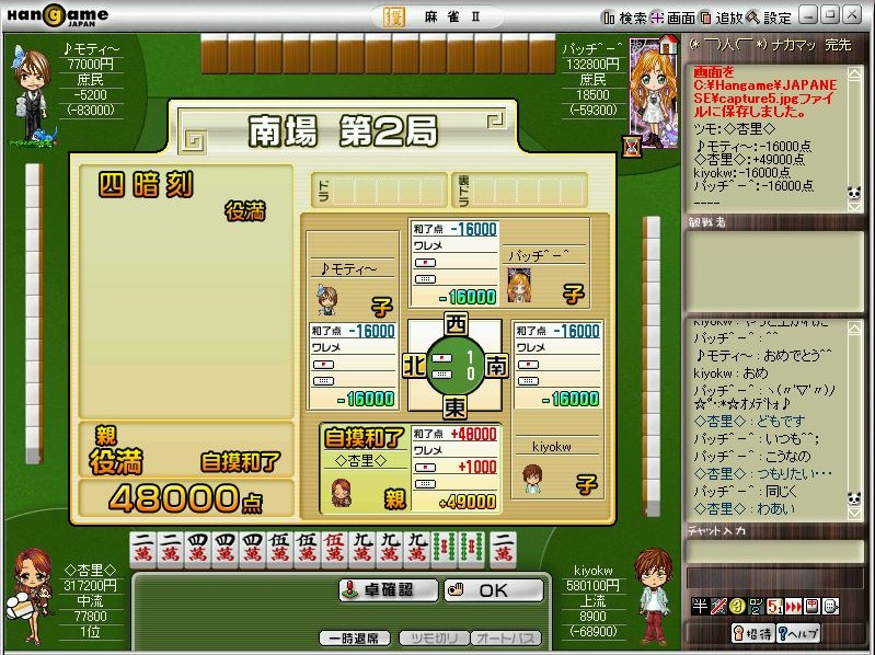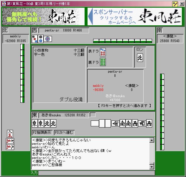 ・・・と、まぁ、昨夜は気分良く眠りにつけたんですけど、この運の良さは今日も続いているみたいで、ハンゲームの麻雀でも、なんと・・・